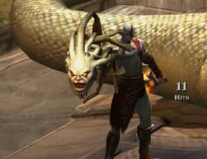 Kratos harus membuat minimum 25 (atau 35 untuk mendapatkan bonus) gorgon menjadi batu dan menghancurkannya dalam waktu 200 detik. Golden Fleece sangat berguna disini. Tangkislah serangan gorgon dengan menggunakan Golden Fleece. Tekan L1 lalu kotak untuk mengembalikan sinar hijau sebelum sinar hijau dari gorgon mengenai Kratos. Segera hancurkan musuh yang menjadi batu.